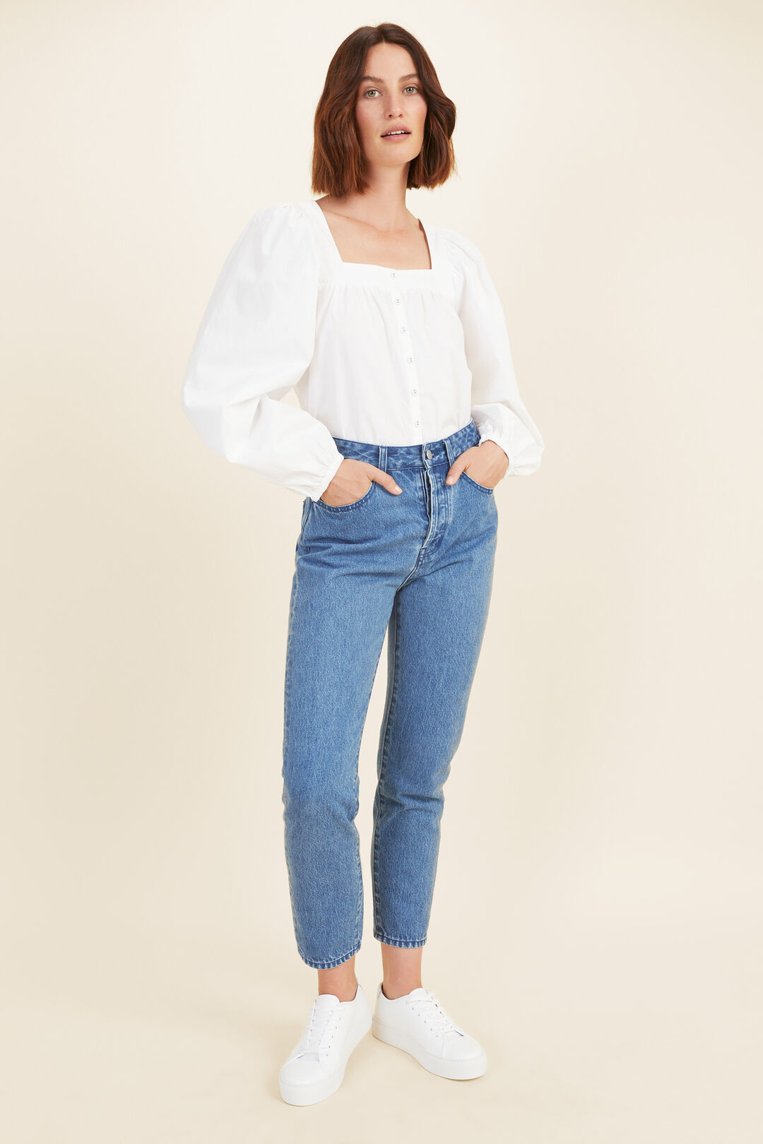 This charming blouse is crafted from 100% cotton poplin, giving a structured finish to the flowy design. The flattering, straight neckline gives way to blouson style sleeves, while covered buttons dot the front of the blouse. The material flows from the neckline into a straight silhouette, and the blouse is slightly cropped.