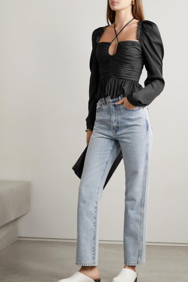 The blouse is cut from satin with a plunging neckline framed by halterneck ties. It has gently puffed shoulders skimmed with ruffles and a nipped-in waist that falls to a delicate peplum hem. Wear yours with jeans and pumps.