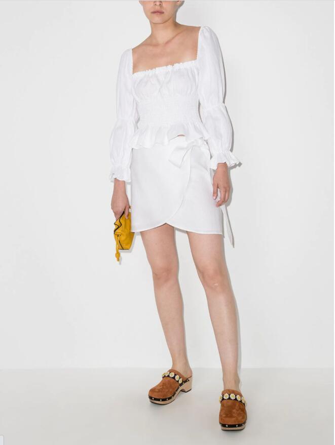 Sax linen wrap miniskirt This Sax miniskirt from Reformation is sustainably crafted from linen in the United States. Featuring a high waist, it boasts a wrap design with a tie fastening that creates a bow detail, adding a signature whimsical feel to the piece.